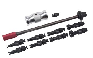 Kit includes a slide hammer with knock head and 8 x expandable split collet adaptors from 8 - 32mm (5/16" - 1 - 1/4")