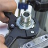 Tempered C-hook wrench is specially designed for use with slotted retaining rings, such as motorcycle monoshock suspension and rear wheel hub’s eccentric axle for chain elasticity