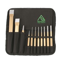 Set of 11 chisels and punches in handy canvas tool roll with clip.